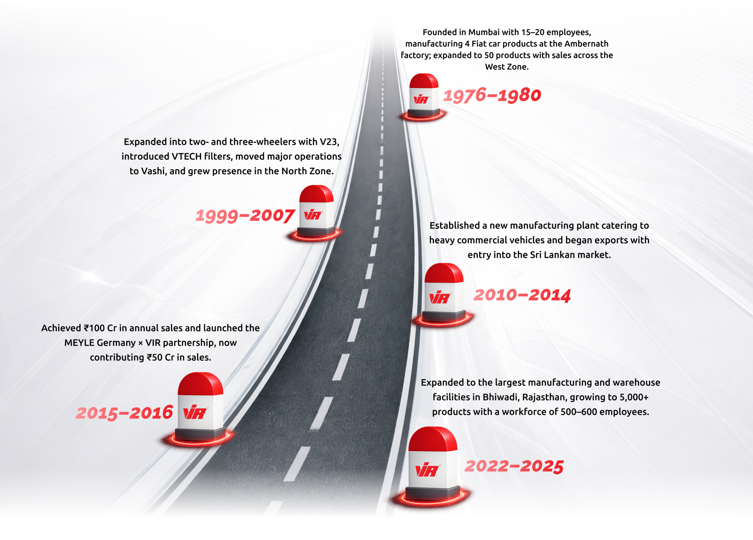 Established in 1976, VIR Group is a trusted name in the Indian automotive aftermarket, built on nearly five decades of manufacturing excellence, disciplined operations, and customer trust. What began as a small venture in Mumbai has grown into a multi-location, multi-product automotive components group, serving customers across India and international markets.